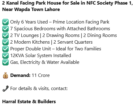 2 Kanal Facing Park House for Sale in NFC Society Phase 1, Near Wapda Town Lahore